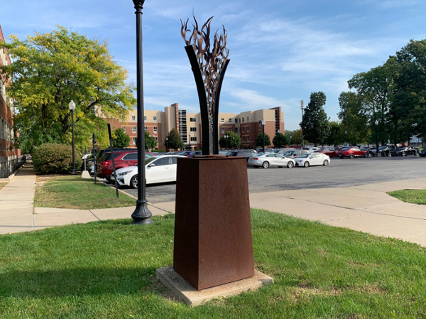 Three sculptures stand in front of the Krannert Memorial Library. Numinous Wedge is a wood and steel work by Jay Dougan, a professor and artist living in Colorado.