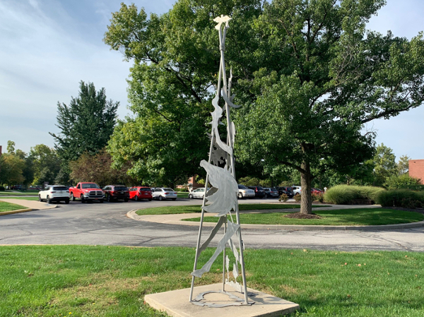 Near the west entrance of campus, next to the Fifth Third Bank, stands the bright yellow steel sculpture Sol y Sombra by Bernie Carreño. The sculpture was inspired by brilliant sunlight at a bullfight in Madrid, Spain. Carreño received his BFA and MFA in sculpture from the University of Wisconsin-Milwaukee. He is currently the head of the Sculpture Department at the Indianapolis Art Center. In addition to his role at the IAC, he is a working sculptor with numerous commissions and awards to his credit.