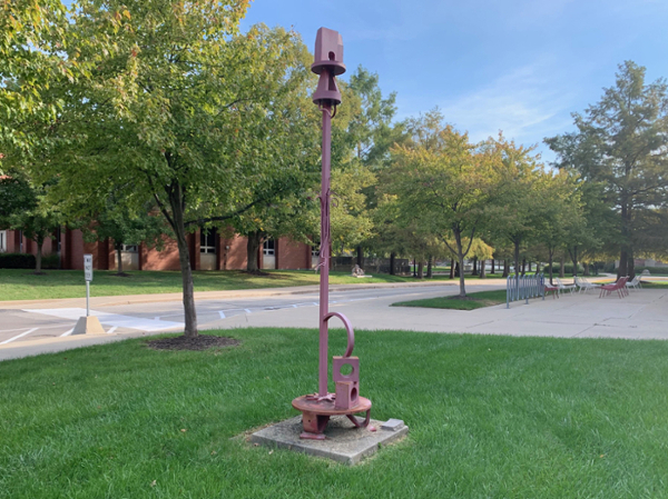 On a Worldly Roll by Garry Bibbs, made of stainless steel and bronze, welcomes visitors to campus from the west on Hanna Avenue. Garry Bibbs is on the faculty of the University of Kentucky. His work can be seen in numerous public and private collections.