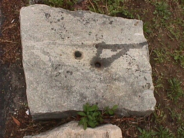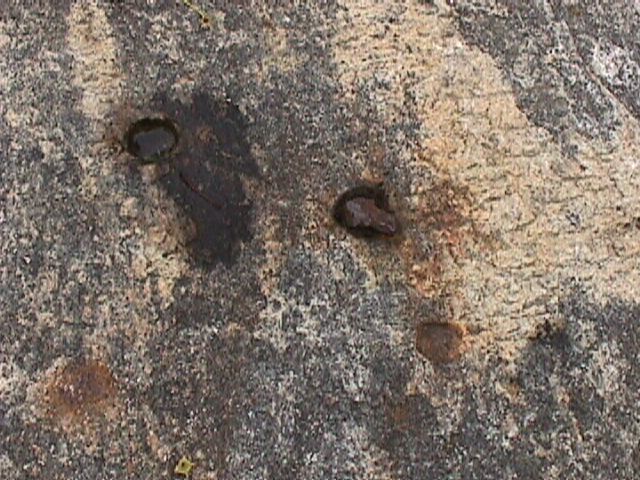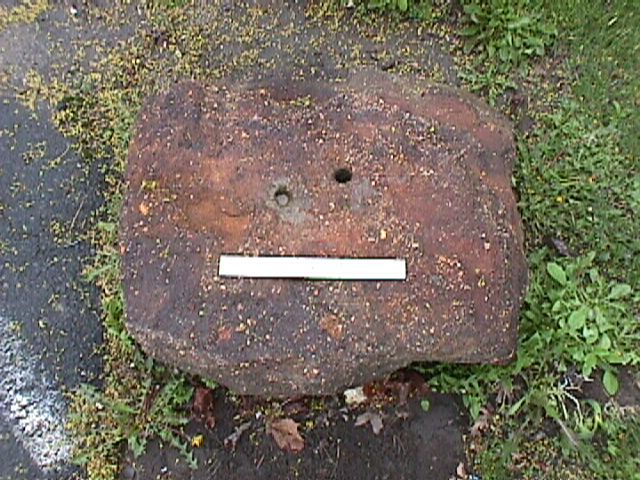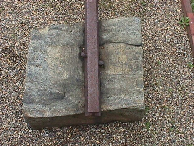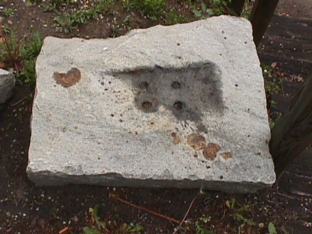 This was used by the Allegheny Portage RR, which was built over the spine of the Alleghanies between Altoona and Johnstown, PA, in the 1830s. See those two hand-drilled holes on top of the stone? Locust pegs were driven into the holes, and the spikes were then driven into the Locust pegs.