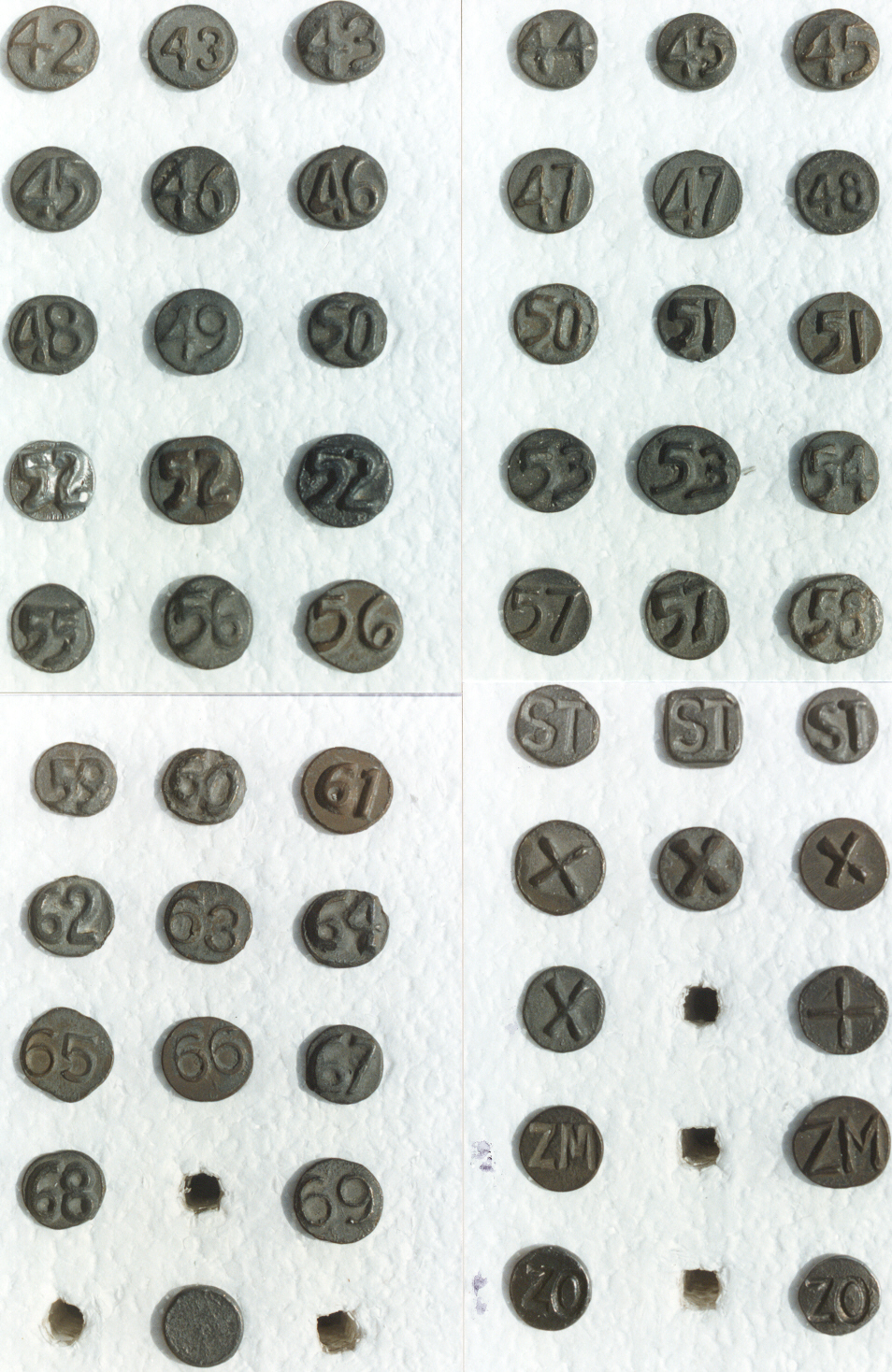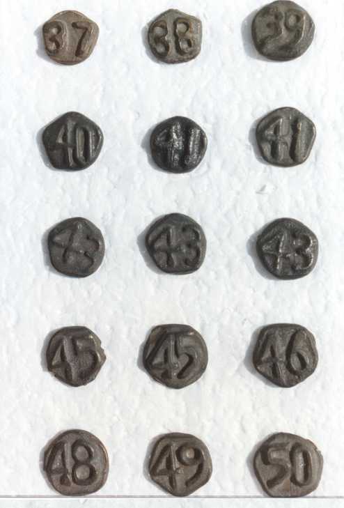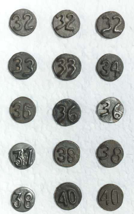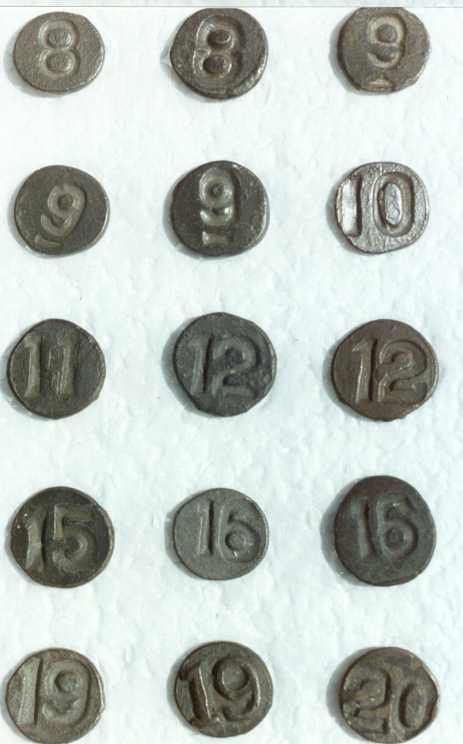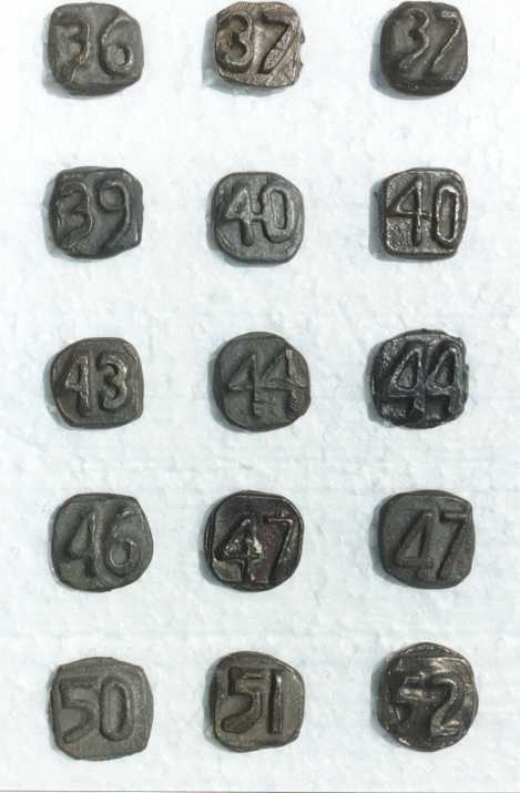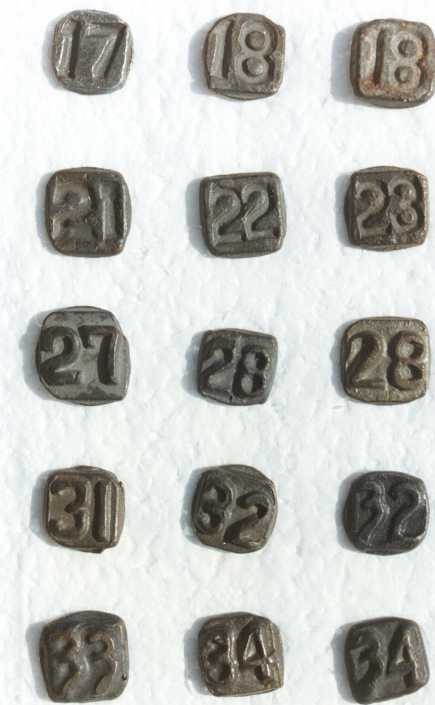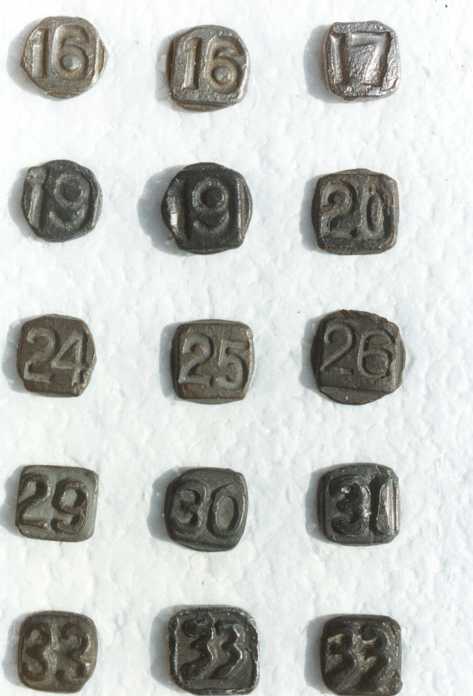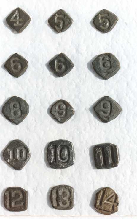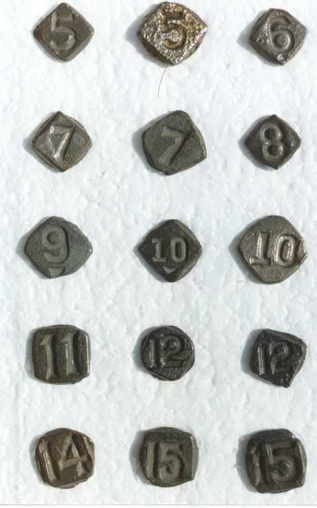 15 diamond/square date nails numbered 4-14 (diamond for singe digits, square for double digits)