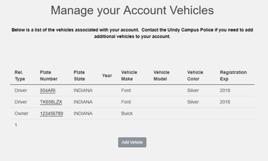 - Click on the Plate Number for the vehicle that you want to correct or Click on the Add Vehicle button if you need to add a new vehicle that will require a permit and proceed to step #7.