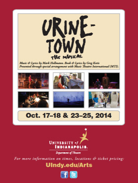 A musical and winner of three Tony Awards, including Best Book and Score, and one of the most uproariously funny musicals in recent years, Urinetown is a hilarious tale of greed, corruption, love, and revolution in a time when water is worth its weight in gold. In a Gotham-like city, a terrible water shortage, caused by a 20-year drought, has led to a government-enforced ban on private toilets. The citizens must use public amenities, regulated by a single malevolent company that profits by charging admission for one of humanitys most basic needs. Amid the people, a hero decides he has had enough, and plans a revolution to lead them all to freedom!