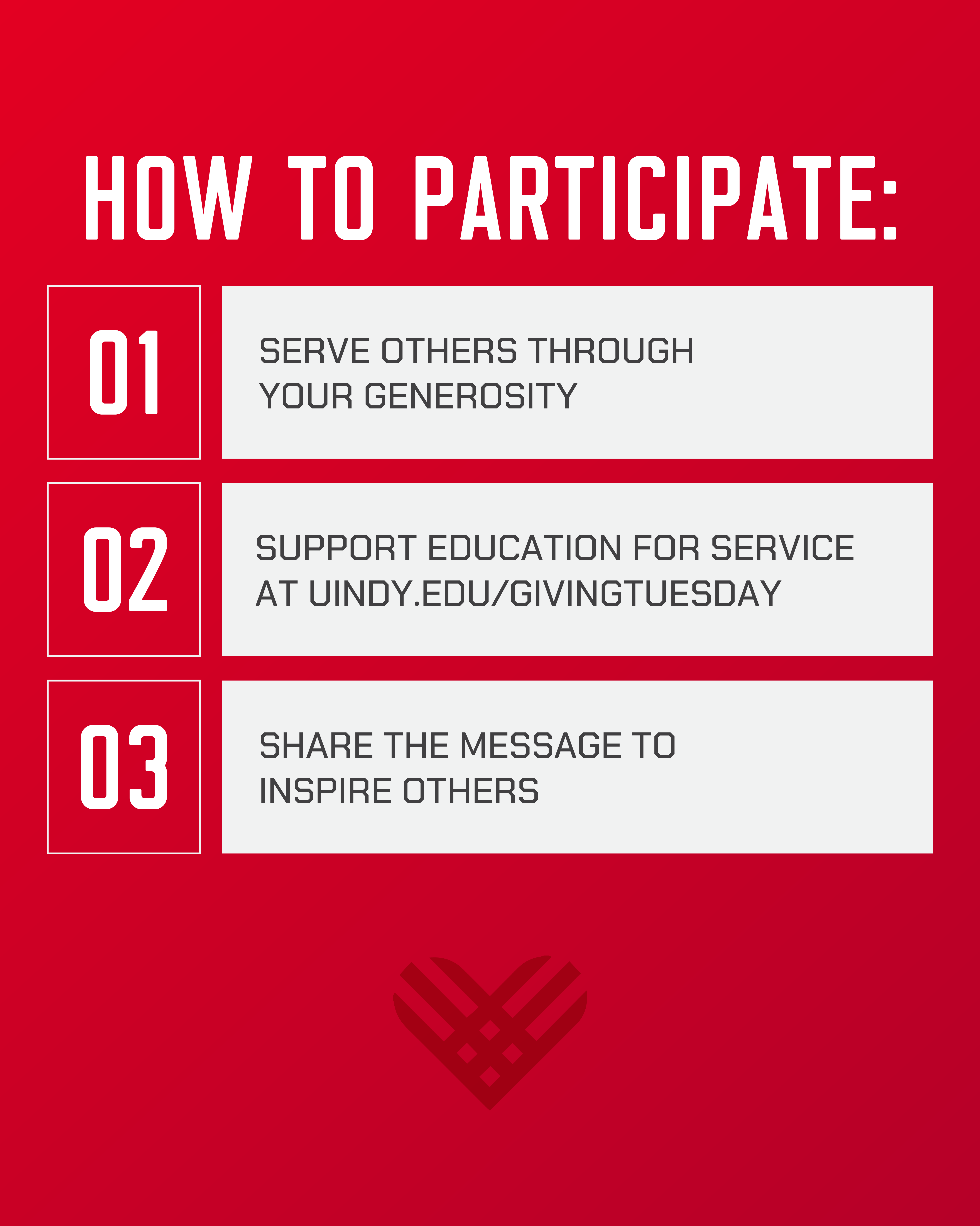 - Support UIndy's Education for Service at uindy.edu/givingtuesday